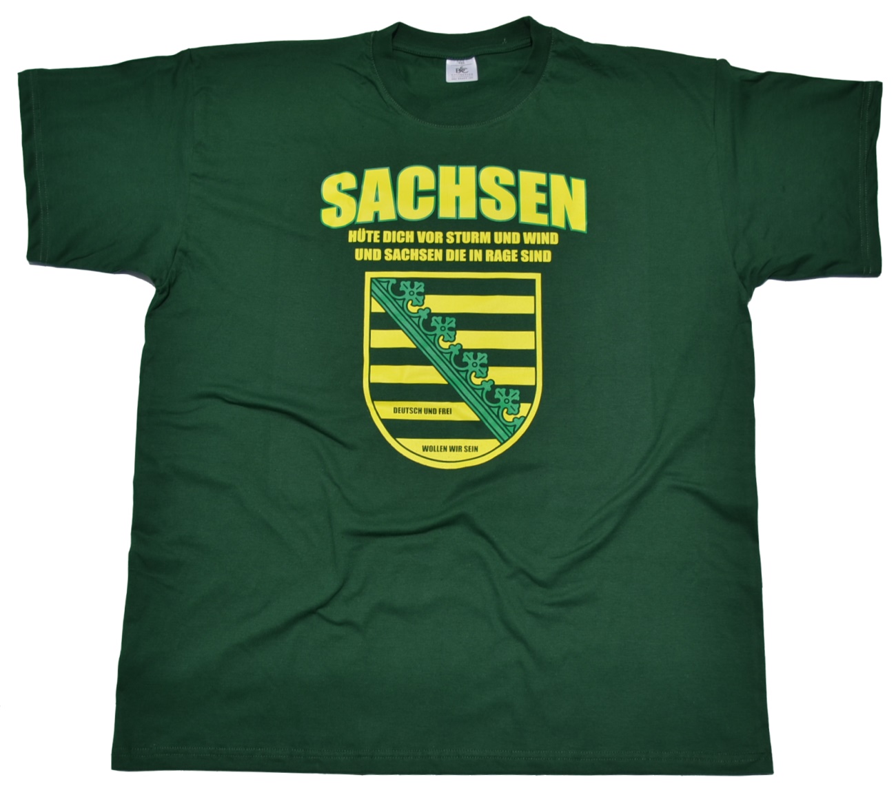 T Shirt Sachsen deutsch und frei, vorn großer Motiv-Druck: Wappen - Sachsen Hüte dich vor Sturm und Wind und Sachsen die in Rage sind Deutsch und Frei wollen wir sein -